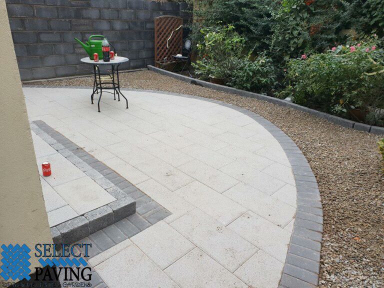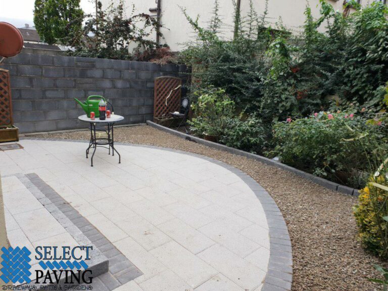 We redesigned the entire area, putting in new foundations, a new step, a curved patio area built with Newgrange slabs and a charcoal border. We put in a new step at the back door built with a tumbled block kerb and a newly shaped lawn area using artificial grass for a low-maintenance garden.