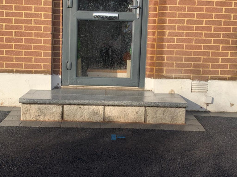 This project has been installed by Select Paving in Glasnevin, Dublin, and it features an asphalt top surface with new retaining walls built with rockface blocks. A grey granite borderline encloses the driveway, and there's a new matching granite step at the entrance.