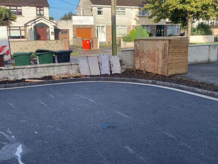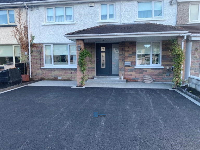 Select Paving installed a new driveway in Beaumont, Dublin, featuring an asphalt top surface with a granite cobbled apron, a large doorstep area and raised flowerbeds on both sides.