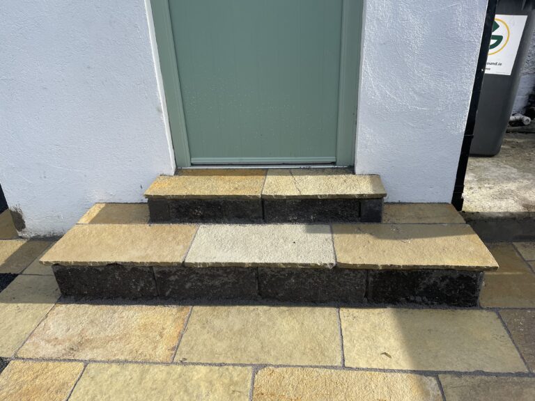 Work Done: Excavated And Removed The Area, New Base Foundation Installed, Natural Stone Border, Membrane Weed Block, New Step(s)