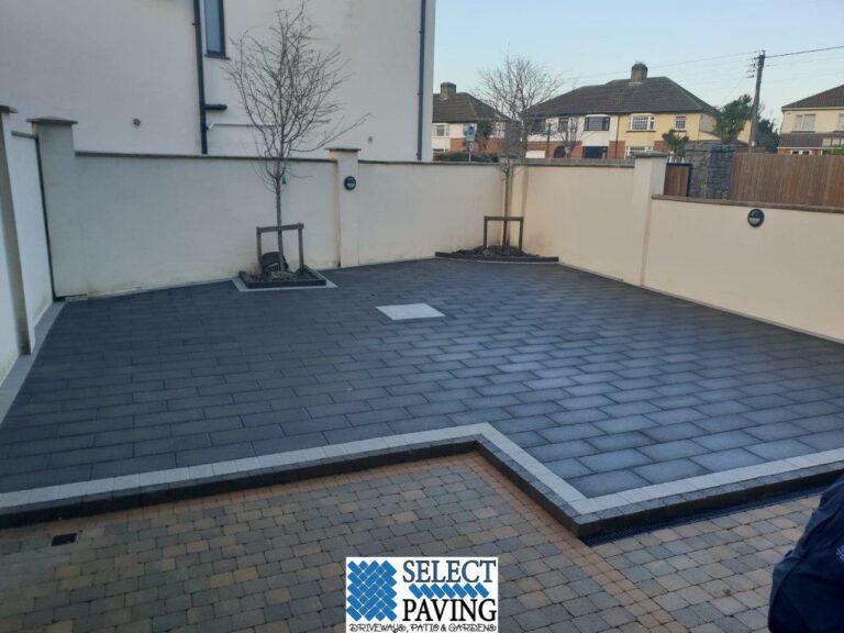 New block paving installation in Dun Laoghaire completed by Select Paving. We transformed the front of a garden area from a lawn area into an elevated paved area using Lismore paving from Kilsaran. We elevated it using a medium cobble block and put a dropped-down area to blend in with the existing driveway.