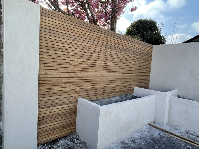 Work Done: Removed Trees and Bushes, Excavated And Removed The Area, Extended The Area As Agreed, New Base Foundation Installed, Lowered The Levels, New Walling Built, Membrane Weed Block, Wooden Fencing, Rendered Walls