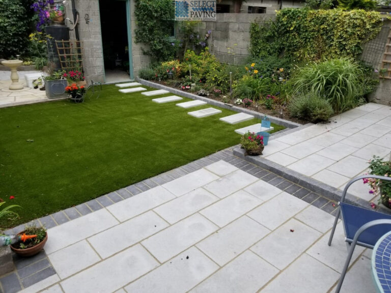 Completed patio installation in Lucan, Co. Dublin. New patio with the elevated area. Tumbled large kerb blocks used as restraints for flower beds and for the elevated area. Charcoal Kilsaran paving block used as a border around the patio area. Stepping stones laid on the new artificial lawn that was installed.