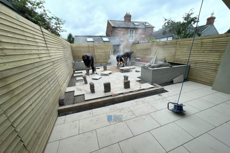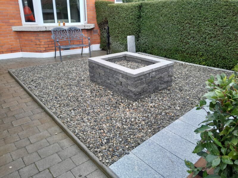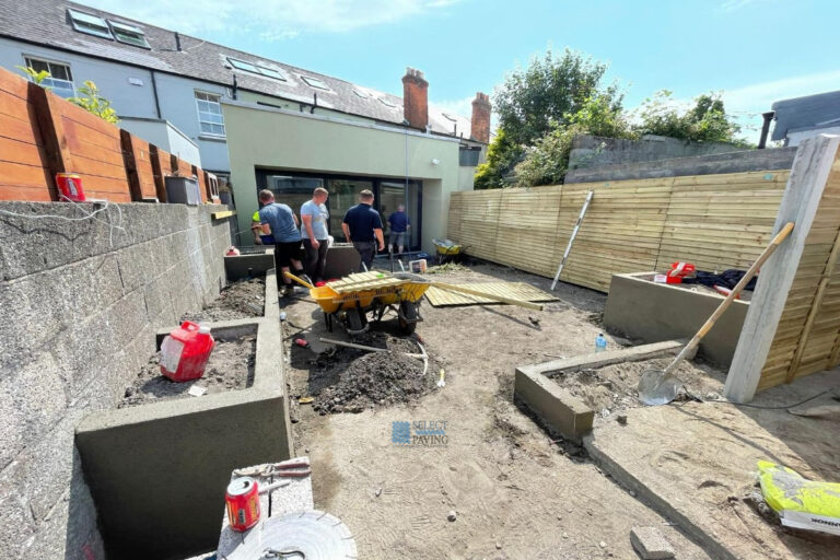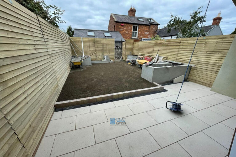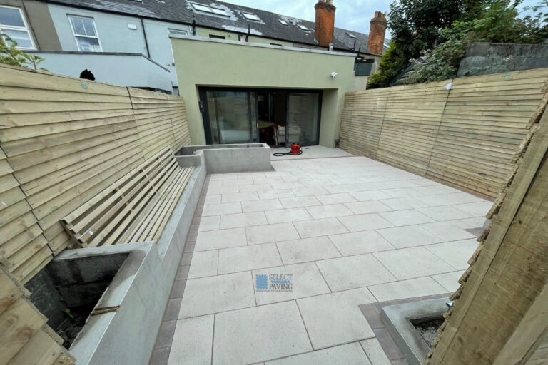 Select Paving installed a new patio in Ranelagh, Dublin. The project features Kilsaran granite flagstones, new panel fencing, and boxed and rendered flower beds with an inbuilt bench.