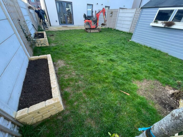 Work Done: Excavated And Removed The Area, Removed The Garden, New Base Foundation Installed, Built-Up The Levels, New Drainage System, Membrane Weed Block, New Flowerbeds