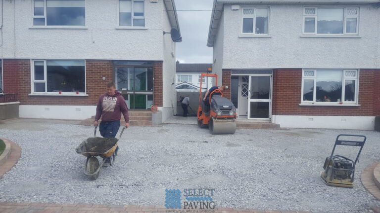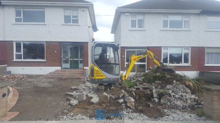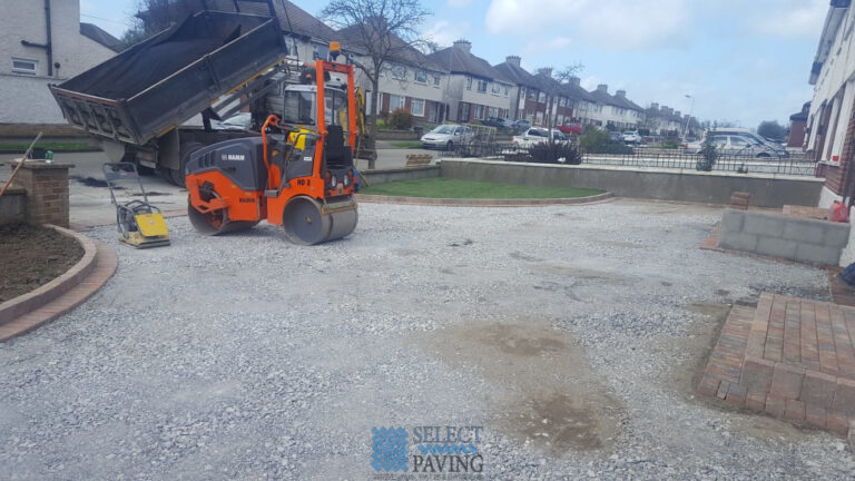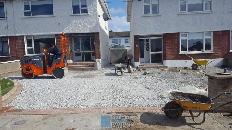 Tarmac driveway installation in Dublin. Two neighbours with joined driveways. Existing driveway areas, including lawns removed. New base installation. A paved border was installed and benched in concrete. Two new steps were installed in front of the houses.