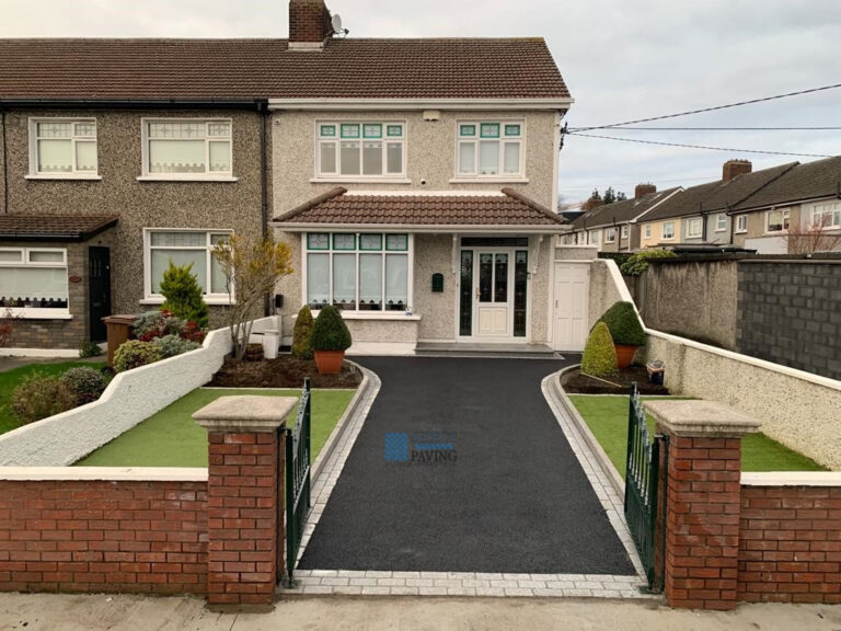 This transformation features a tarmacadam surface with natural granite cobblestones for the borderline, raised kerbing, granite step and artificial grass on both sides of the driveway. This job took place in Artane, Dublin.