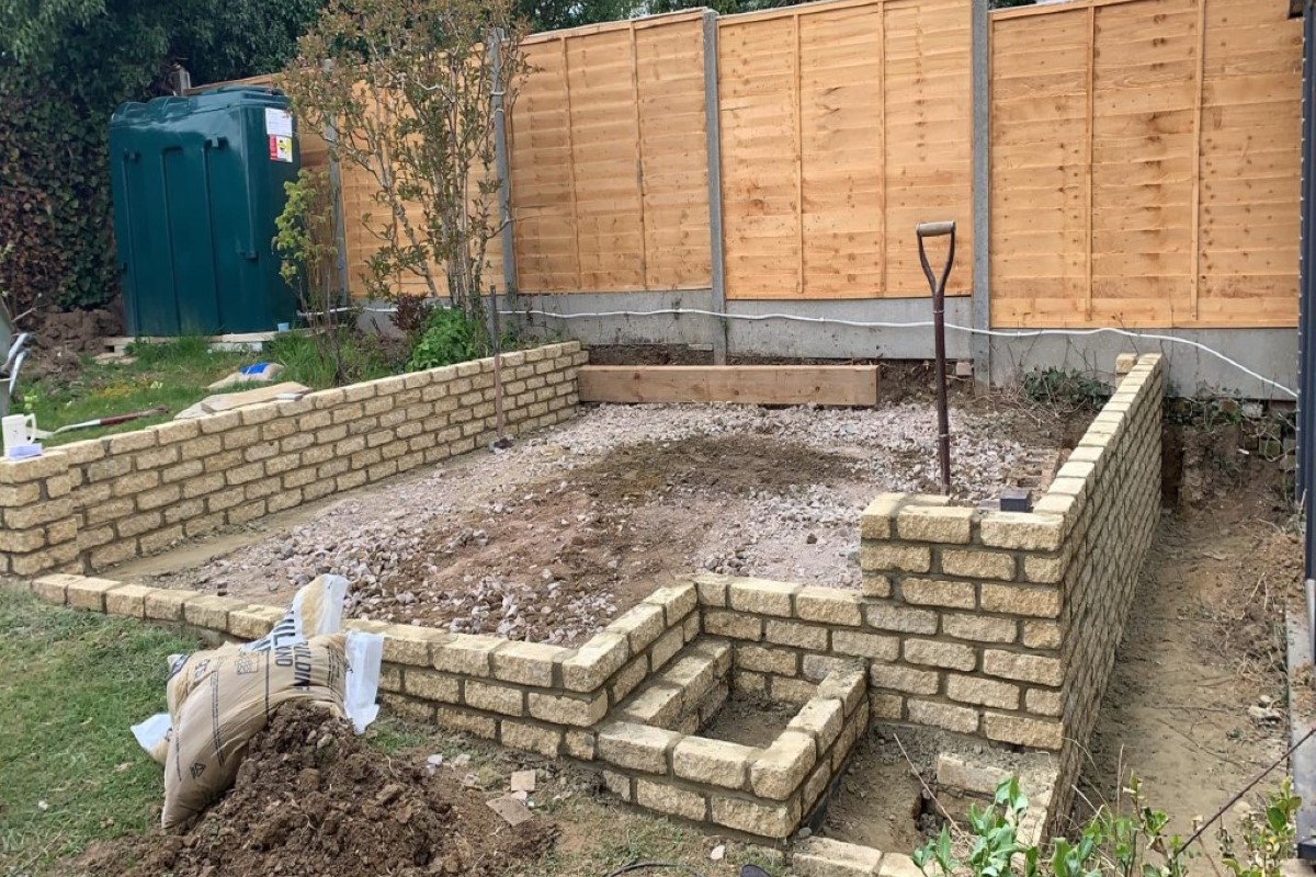 Work: Excavated And Removed The Area, Extended The Area As Agreed, Removed The Garden, New Base Foundation Installed, Built-Up The Levels, New Walling Built, Natural Stone Border, New Step(s), New Flowerbeds, Built Brick Pillars